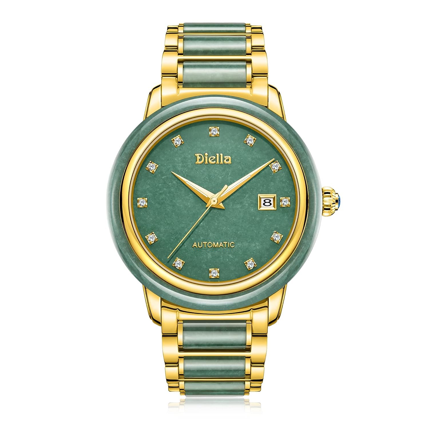 Reloj de mujer automático mecánico de lujo de Diella, reloj de moda para damas con jade y oro inoxidable (Modelo: AD6001L) (Jade verde y oro)