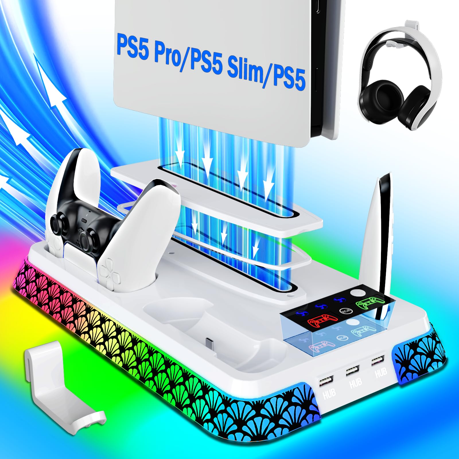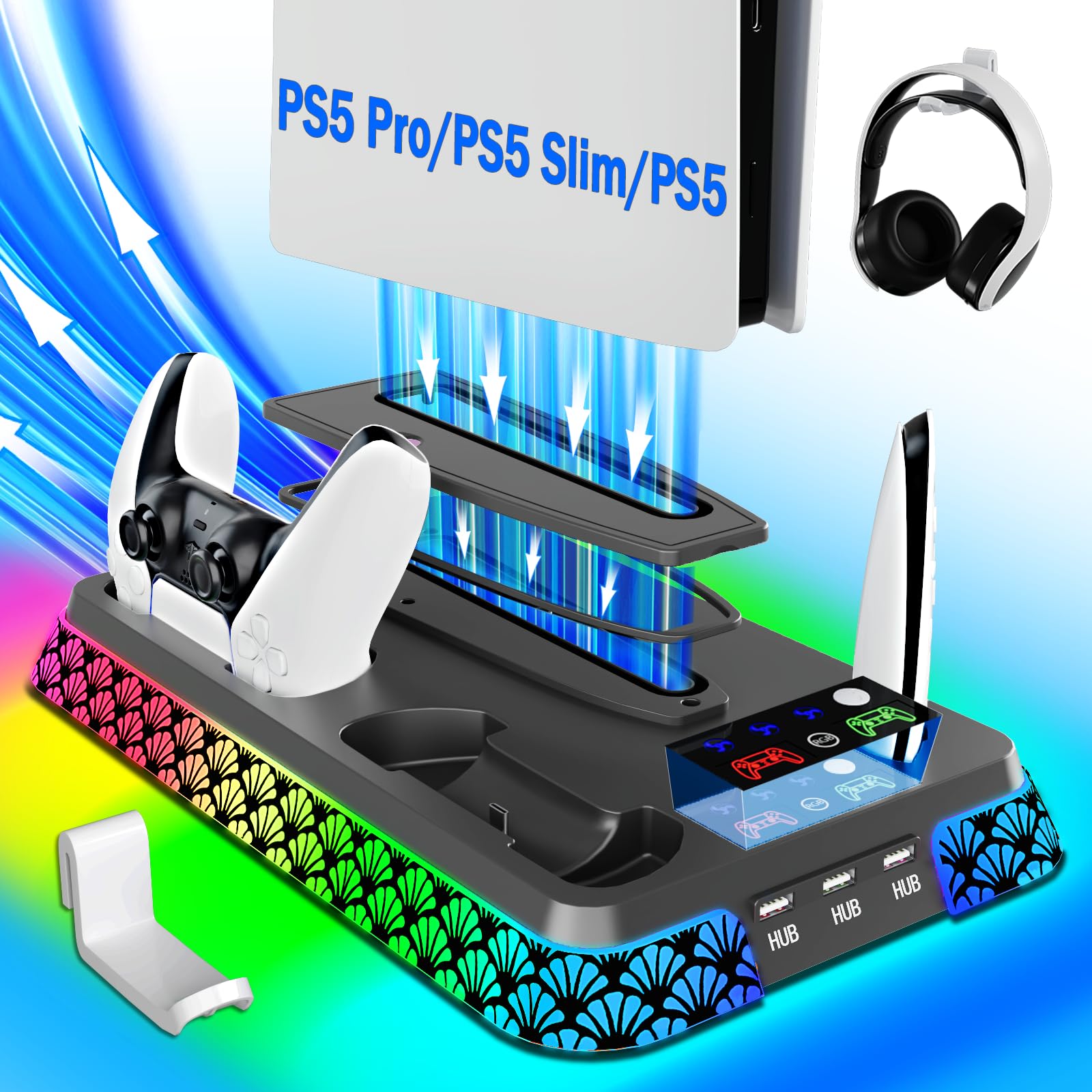 Estación de Enfriamiento para PS5 Stand RGB con Estación de Carga de Controladores Doble para la Consola PlayStation 5, Accesorios para PS5 incluyendo Cargador de Controlador, Ventilador de Enfriamiento, Soporte para Casco, 3 Hub de USB